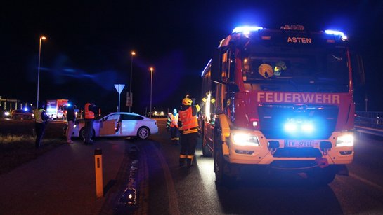 In den letzten Minuten der Aufbauarbeiten forderte uns abermals ein Notfall: Der Lenker eines PKW verlor im Kreisverkehr bei der Ortszufahrt die Kontrolle über sein Fahrzeug und krachte in eine Straßenlaterne. Durch die Wucht des Aufpralls riss der Masten dem Pkw die rechte, vordere Radaufhängung aus dem Fahrwerk und knickte infolge dessen um.